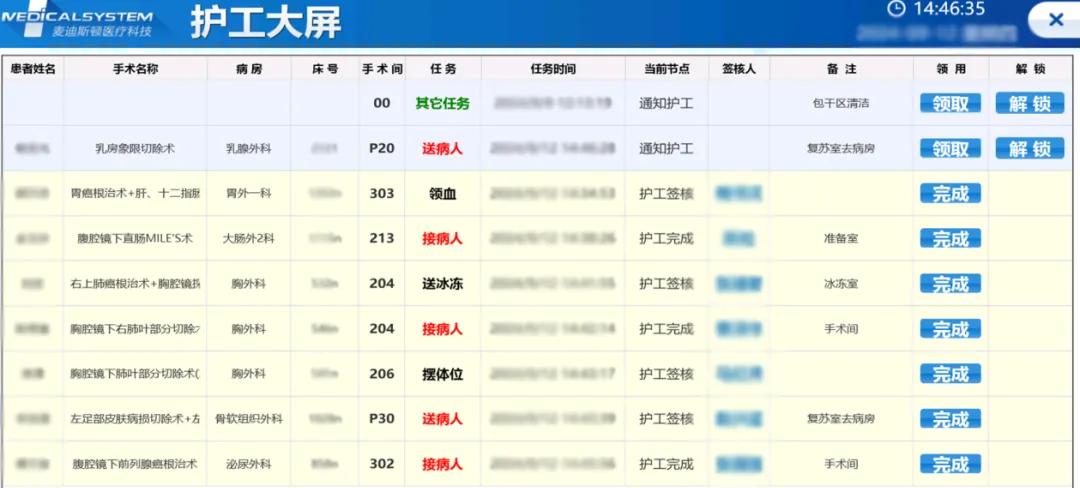 徐匯院區(qū)還配套上線(xiàn)了護(hù)工管理系統(tǒng),醫(yī)護(hù)人員在手術(shù)間發(fā)起各類(lèi)任務(wù)(送病人、清掃、領(lǐng)血、送冰凍、擺體位等),護(hù)工人員在工勤等待區(qū)大屏掃碼領(lǐng)取任務(wù),任務(wù)結(jié)束后,再次掃碼確認(rèn)任務(wù)完成。該系統(tǒng)全面覆蓋了患者接送任務(wù)的發(fā)布、領(lǐng)取及完成的整個(gè)流程,確保了手術(shù)過(guò)程的安全性,并有效提高了工作協(xié)同的效率。