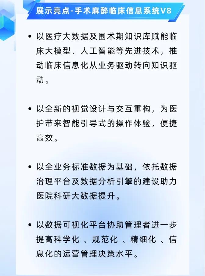 十年光陰荏苒,瑞金醫(yī)院再次走在了行業(yè)的前列,率先試行麥迪科技全新一代DoCare手術(shù)麻醉臨床信息系統(tǒng)V8.0(以下簡稱麻醉V8.0)。麻醉V8.0提供覆蓋術(shù)前、術(shù)中、術(shù)后各環(huán)節(jié)的全過程智能化支持,使用對象包括醫(yī)院管理者、麻醉科主任、麻醉醫(yī)生、手術(shù)護士等角色,可應(yīng)用于住院、門診、急診等多元化手術(shù)麻醉業(yè)務(wù)場景。相對于手術(shù)麻醉臨床信息系統(tǒng)V5.0,麻醉V8.0并非單純的軟件升級,而是通過全新的視覺UI設(shè)計和交互方式的重構(gòu),為麻醉醫(yī)護人員提供了更為友好和便捷的使用體驗;通過醫(yī)療大數(shù)據(jù)及圍術(shù)期知識庫賦能臨床大模型、人工智能等先進技術(shù),推動臨床信息化從業(yè)務(wù)驅(qū)動轉(zhuǎn)向知識驅(qū)動;通過構(gòu)建圍術(shù)期標準數(shù)據(jù)集,有效解決數(shù)據(jù)孤島、格式不一、質(zhì)量參差不齊等問題,助力醫(yī)院科研能力的提升。